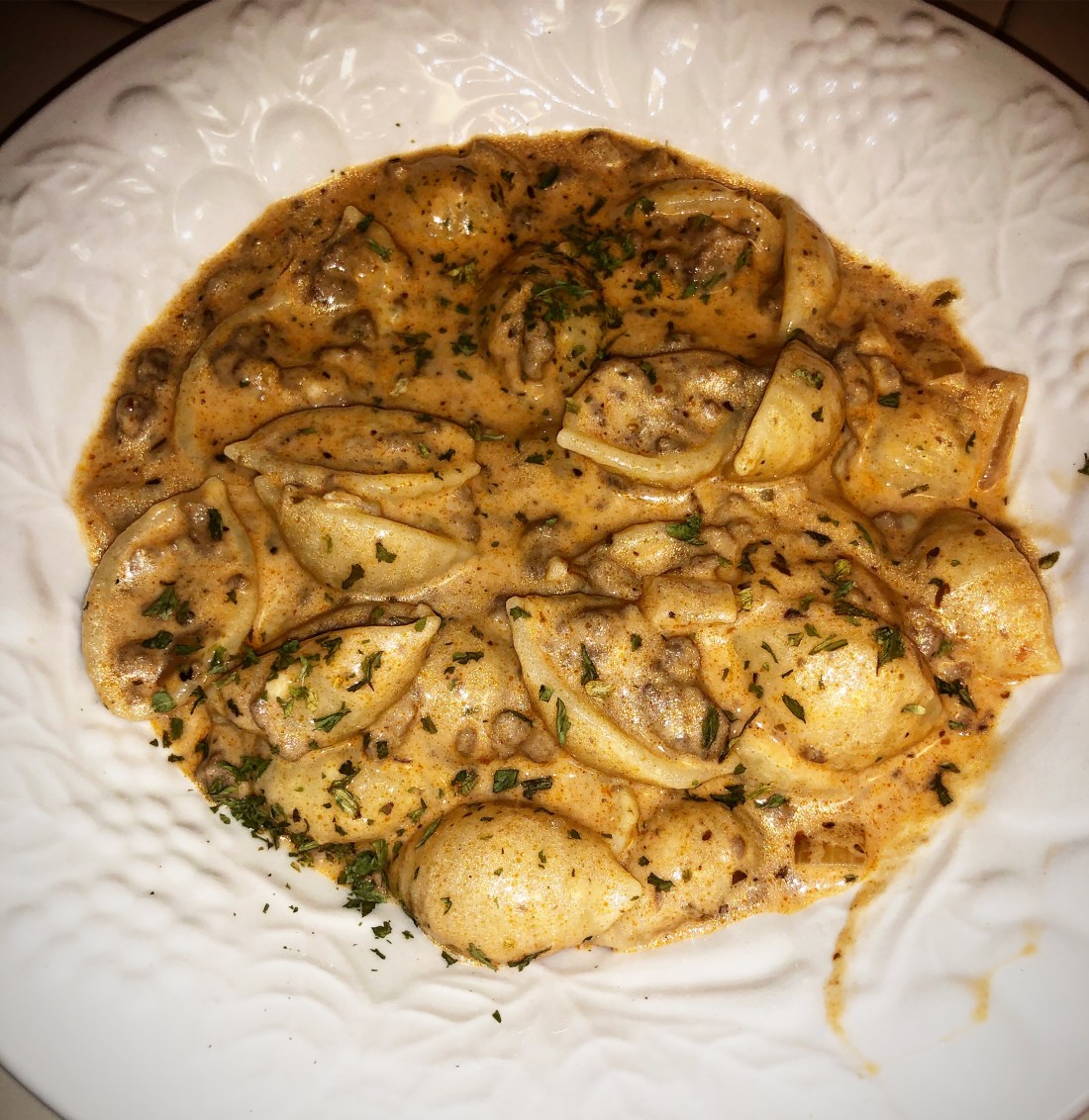 Step 5: Add elk and pasta into pan and mix. Add in heavy cream and sour cream and mix everything together. Add shredded cheddar cheese into pan until melted.