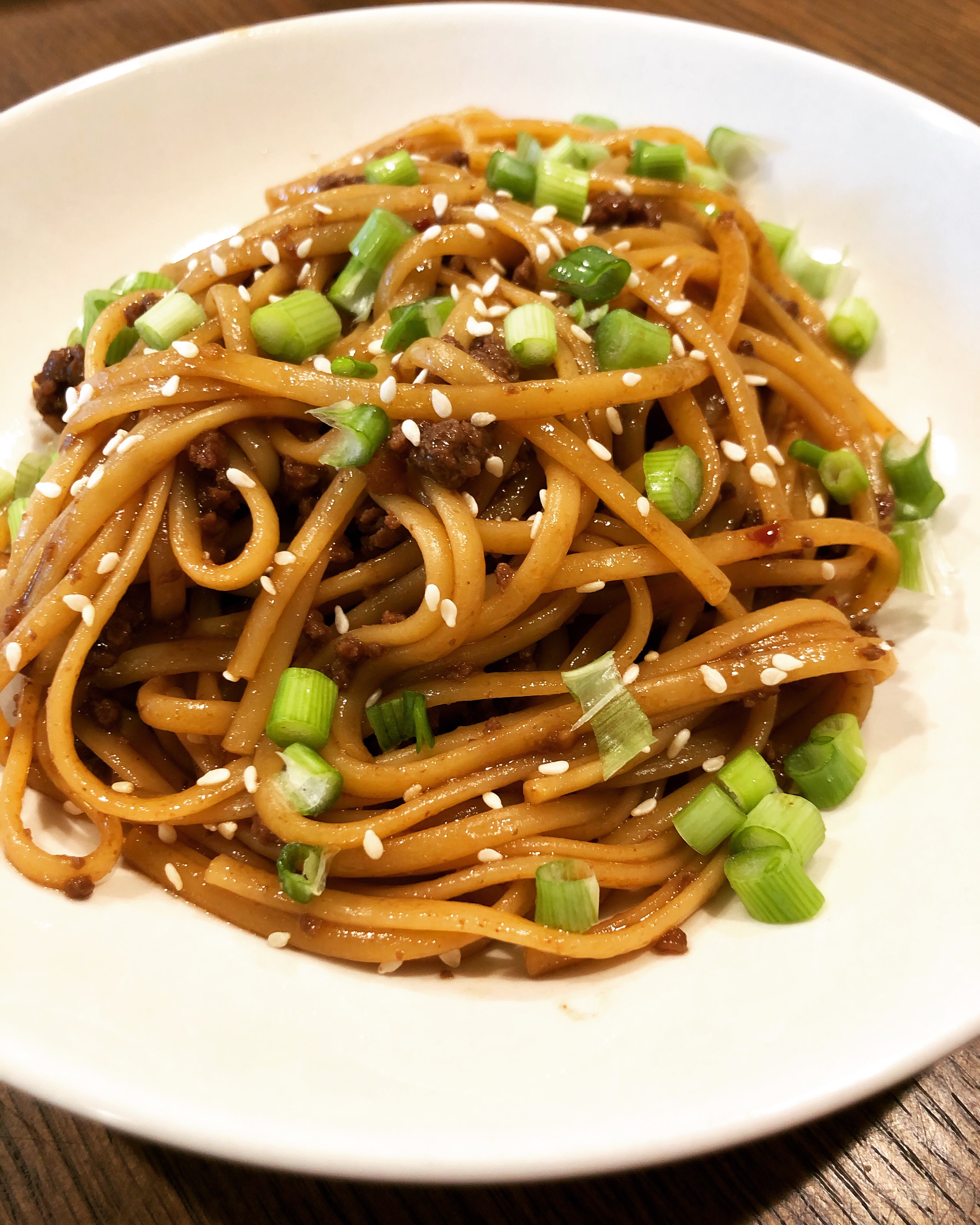 Step 3: once noodles are done drain and add to pan with ground elk. Stir until noodles are coated and begin to turn brown in color. Once mixed add chopped green onions and top with sesame seeds.